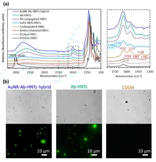 The immobilization of anti-E. coli antibody onto the HNTs surface was investigated using FTIR-ATR and immunogenic labeling, as depicted in Figure 1a,b, respectively. The FTIR-ATR spectrum of HNTs depicts two characteristic peaks at 3698 and 3618 cm−1 ascribed to the Al-OH groups of the alumina portion of HNTs [,]. These diminish upon the acidic etching of HNTs, indicating a high degree of alumina removal [,]. Aminosilanization of the etched HNTs results in the addition of bands at 1564, 1487, and 1382 cm−1 associated with grafted surface amine and CH2 deformation [,,]. Following the reaction between the surface amine residues and the succinic anhydride, new bands are observed at 1632, 1552, and 1398 cm−1, and are ascribed to the carbonyl residue in a newly formed amide bond and the stretching vibration of a carboxyl residue [,]. The spectrum of the reactive Sulfo-NHS intermediate includes two additional bands at 1789 and 1737 cm−1, characteristic of cyclic imides [,]. The disappearance of these two bands after PA conjugation implies a successful nucleophilic substitution between PA amine and the Sulfo-NHS leaving group [,]. Antibody introduction is accompanied by the intensification of the amide bands, suggesting a higher content of protein in the sample, which could be explained by the immobilization of the antibody onto its PA anchor at the proper orientation (see the green trace in Figure 1a [,]). No changes in the FTIR spectrum were observed after the AuNRs incorporation (blue trace in Figure 1a); thus, we conclude that this final step did not affect the aforementioned surface modifications, since the metallic AuNRs are not expected to exhibit any FTIR absorption of their own in the range of 3900–650 cm−1 [].