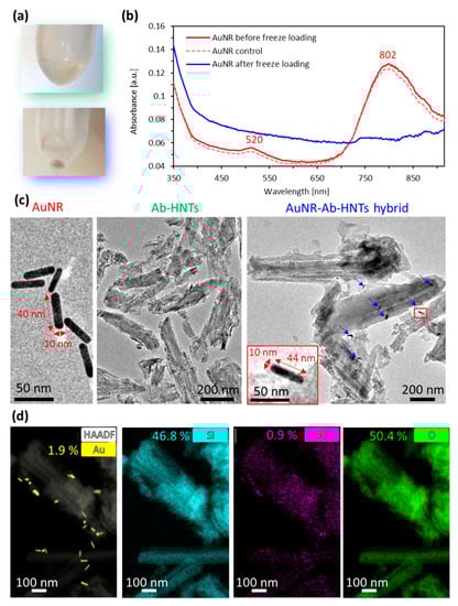 Upon freezing-induced loading of AuNRs onto the Ab-HNTs, the thawed treated Ab-HNTs depicted a visual color change from white to purple-blue (see Figure 2a). The incorporation of AuNRs onto the Ab-HNTs was studied by analyzing the UV-Vis absorption of the AuNR suspension before and after the freezing-induced loading process (Figure 2b). The presented spectra show that both the characteristic main absorbance peak at 802 nm, as well as the secondary peak at 520 nm, disappear following the loading process, indicating that the gold nanorods were incorporated onto the HNTs. The respective gold content in the resulting hybrid was calculated according to Equation (1) to be 1.4%. As a control, an AuNR suspension with no HNTs was similarly processed, and only a minor reduction in peak intensity was observed (see Figure 2b). As for the LSPR absorbance characteristics of the AuNR suspension, the peaks at 802 nm and 520 nm well agree with the nanorod length and diameter, respectively (see TEM image in Figure 2c) [,].