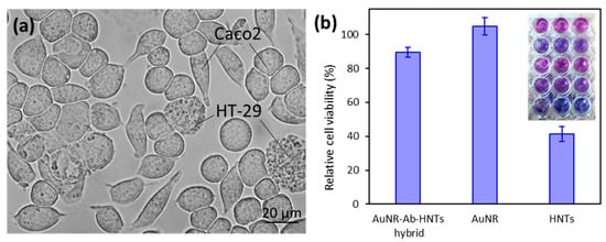 Towards future biomedical applications, the cytotoxicity of the AuNR-Ab-HNTs hybrids was investigated in a co-culture system of human colon adenocarcinoma Caco-2 and mucus-secreting HT29 cells. This co-culture, depicted in Figure 3a, is commonly used at a ratio at of 9:1 (Caco-2: HT29) to mimic the micro-environment of the human colon [,,]. Figure 3b summarizes the cell viability results following exposure to the AuNR-Ab-HNTs hybrids for 24 h, where 89% of the relative viability was measured. The hybrid concentration was kept similar to that used for the photothermal activity studies (1500 µg mL−1 HNTs). Notably, exposure to the control pristine HNTs resulted in a 60% reduction in relative cell viability. These results agree with previous reports where the biocompatibility of pristine HNTs has been improved by their coating with polyethylene glycol (PEG) [], or proteins [,]. Moreover, pristine HNTs have been shown to stimulate cell processes related to cell infection and cell injury in a similar Caco-2/HT29 co-culture exposed to a concentration > 10-fold lower (100 µg mL−1) than that used in this work [].