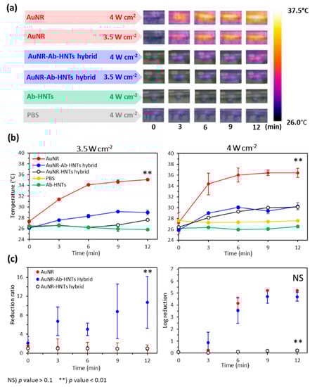 The AuNR-Ab (anti-E. coli)-HNT hybrids were mixed in E. coli suspensions, and their antibacterial photothermal activity was characterized. The results are summarized in Figure 4c, presenting the bacterial reduction as measured using the plate count method. Interestingly, the irradiated AuNR-Ab-HNTs hybrid exerted a 90% reduction in bacterial viability at a power density of 3.5 W cm−2, whereas no bactericidal effect was observed for the suspension of free AuNRs with equal gold content (p < 0.01). At a power density of 4 W cm−2 (Figure 4c, right panel), both the AuNR-Ab-HNTs hybrids and free AuNRs induced a similar bactericidal effect of ~5 log reduction (p > 0.1). This is the first time that such strong photothermal antibacterial activity has been reported for HNTs decorated with gold nanoparticles (see Table S1 in the Supporting Information). Moreover, these values are comparable to those reported for different free AuNR systems in which the achieved temperature increase was 10–30 °C higher than that measured for the hybrids in this study (see Table S2 in the Supporting Information [,,]). The incorporation of gold nanorods onto pristine HNTs, without antibodies, dramatically impaired the latter’s antibacterial photothermal capabilities, probably due to the clustering of AuNRs onto the HNTs’ surface, away from the bacterial cells.