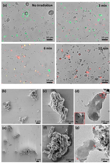 Light and electron microscopy imaging of the antibacterial photothermal effect exerted by AuNR-Ab-HNTs hybrids—mixtures containing AuNR-Ab-HNTs hybrids and E. coli irradiated using a 808 nm laser (4 W cm−2) and imaged using (a) overlay of bright-field and fluorescence microscopy after irradiation time of 0, 3, 6, and 12 min (upper panel left to right and bottom panel left to right, respectively). Bacteria were labeled with Live/Dead staining: Green—Syto9, Red—propidium iodide; (b,c,f) SEM for 12 min irradiation; and (d,g) TEM for 12 min irradiation. (High contrast gold nanorods are indicated by red arrows. The red frame inset depicts higher magnification of the region of interest marked with a red rectangle.) (e) SEM micrograph of untreated E. coli cells.