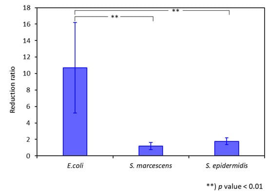The selectivity of the photothermal activity of the AuNR-Ab-HNTs hybrids was investigated with two non-target bacteria species: Serratia marcescens (Gram negative) and Staphylococcus epidermidis (Gram positive), and the results are depicted in Figure 6. It is evident that the irradiated AuNR-(anti-E. coli) Ab-HNTs hybrids exhibited an order of magnitude higher potency against the target bacteria (E. coli), in comparison to the non-target bacterial cells. Therefore, we conclude that the photothermal antibacterial activity of gold nanorods could be selectively enhanced by their incorporation onto antibody-functionalized HNTs.