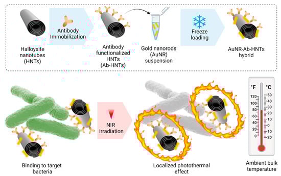 Antibody-functionalized HNTs loaded with AuNRs (AuNR-Ab-HNTs hybrids) for the localized photothermal neutralization of bacteria. The upper panel details the fabrication route, including the immobilization of an antibody onto the HNT surface, followed by the incorporation of the AuNRs onto the functionalized HNTs via the freezing-induced loading technique. The bottom panel describes the concept of HNT targeting of bacteria through antigenic recognition and the consequent localized ablation exerted by the AuNRs upon irradiation, with NIR light neutralizing the bacteria, yet retaining a mild bulk temperature.
