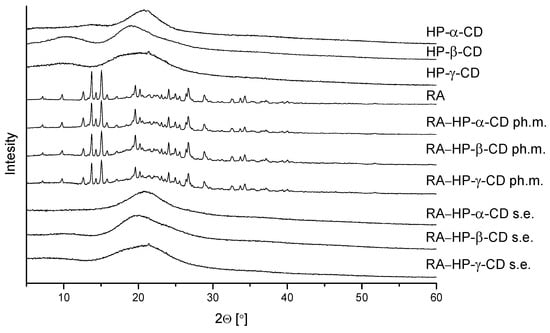 An XRPD study was carried out to determine the crystallinity of RA, RA, and CDs systems’ and physical mixtures (Figure 2). Pure RA has a crystalline structure. Its diffractogram contains sharp reflexes in the range of 2θ from 10° to 35°. Diffractograms of RA physical mixtures with CDs do not show any decrease in or disappearance of these reflexes, thus, remaining in the crystalline state. However, the diffractograms of the RA systems obtained by solvent evaporation are similar to the diffractograms of CDs. The RA reflexes are imperceptible. Therefore, it is possible to suggest the formation of amorphous dispersions of RA with CDs: HP-α-CD, HP-β-CD, and HP-γ-CD.