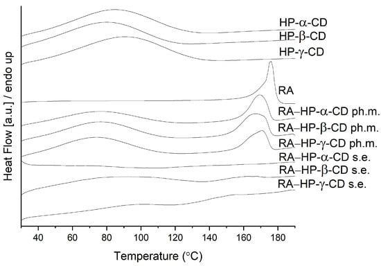 Differential scanning calorimetry (DSC) was used to recognize the thermal properties of the tested systems. Each measurement involved one heating cycle. The thermograms are shown in Figure 3. The DSC curves of RA showed sharp endothermic peaks at 175.8 °C, which are attributed to the melting points [36]. The DSC thermogram of HP-α-CD, HP-β-CD, and HP-γ-CD revealed an endothermic peak at 83.5 °C, 79.6 °C, and 90.5 °C, respectively, which corresponds to the release of water molecules [37]. The physical mixtures were found to contain two distinguishable peaks: one around 76 °C and one in 169.3 °C (RA–HP-α-CD); 76.7 °C and in 167.0 °C (RA–HP-β-CD); and 73.6 °C and in 170.6 °C (RA–HP-γ-CD). The melting endotherm disappeared in all RA–cyclodextrin systems, which indicated the loss of the crystallinity of RA, as well as the formation of intermolecular interactions between RA and cyclodextrin.