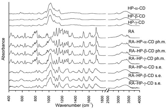 The FT-IR spectra of HP-α-CD, HP-β-CD, HP-γ-CD, RA, physical mixtures: RA–HP-α-CD ph.m., RA–HP-β-CD ph.m., RA–HP-γ-CD ph.m., and systems obtained by the solvent evaporation method (s.e.): RA–HP-α-CD s.e., RA–HP-β-CD s.e., RA–HP-γ-CD s.e.