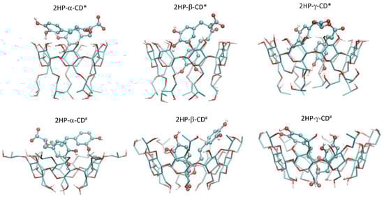 The graphical illustration of the RA–CD systems identified during the docking study. The shown structures are representative of the given type of host molecule. The guest (RA) molecule is shown in a ball-and-stick representation, whereas the host (various derivatives of CDs) molecules are presented in stick representation. Aliphatic hydrogen atoms are omitted for clarity. #: 2-HP-CD# containing all 2-HP groups substituted to the O(2) hydroxyl oxygen atoms of CD (atom numbering in accordance with the IUPAC recommendations); *: 2-HP-CD* containing all 2HP groups substituted to the O(6) hydroxyl oxygen atoms of the hy-droxymethyl groups present in CD.