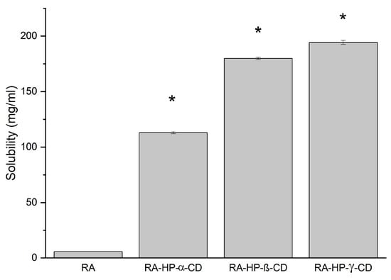 Solubility of RA and RA in binary systems prepared by the solvent evaporation method: RA–HP-α-CD s.e., RA–HP-β-CD s.e., RA–HP-γ-CD s.e. (*) indicates statistically significant differences, p < 0.05.