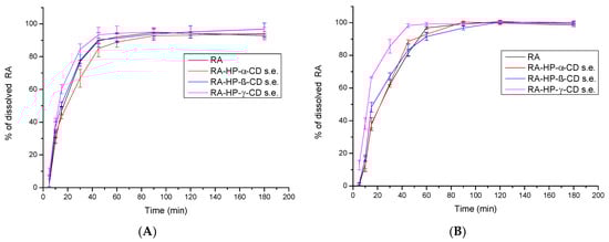 At pH 5.8 (Figure 7B), RA dissolved at 37.97 ± 1.04% in 15 min; in 45 min, it reached 81.48 ± 2.10%. The maximum dissolution level was reached in the ninetieth minute at 99.35 ± 1.27% and remained constant. The dissolution profile of RA in the RA–HP-α-CD s.e. system was almost identical to RA itself. Interactions with HP-β-CD accelerated the dissolution—at 15 min 48.27 ± 2.93%; however, these differences were not statistically significant. RA in the RA–HP-α-CD s.e system reached 66.53 ± 0.43% in the fifteenth minute, and 98.277 ± 1.19% in the sixtieth minute remained constant. The dissolution profile of RA in this system is statistically different from the pure RA.
