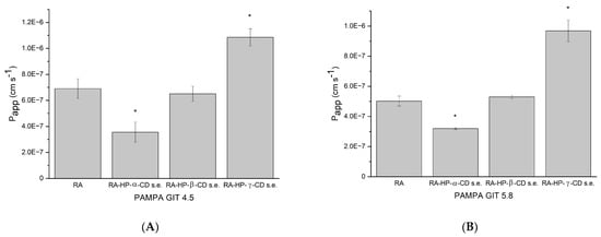 Apparent permeability coefficient values of RA and RA in binary systems prepared by the solvent evaporation method: RA–HP-α-CD s.e., RA–HP-β-CD s.e., RA–HP-γ-CD s.e. in a pH of 4.5 (A) and in a pH of 5.8 (B). (*) indicates statistically significant differences, p < 0.05.