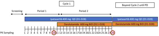 This was an open-label, multicenter, Phase Ib study designed to assess the safety, tolerability, and the drug–drug interaction of the combined administration of 400 mg QD oral ipatasertib and 600 mg BID oral darolutamide. The study was performed in Moldova and Ukraine where 15 patients with metastatic CRPC were enrolled in the study; however, the intended population to be enrolled in this study were both non-metastatic and metastatic CRPC patients. For this study, no prospective calculations of the statistical power were made; the sample size selected was based on a typical sample size used for DDI studies [16]. In this study, ipatasertib 400 mg QD monotherapy was dosed from Cycle 1, Day1 to Cycle 1, Day 10 with or without food, as ipatasertib exposures following a high-fat meal were comparable to that under fasted conditions [17]. From Cycle 1, Day 11 onwards, ipatasertib 400 mg QD was dosed in combination with darolutamide 600 mg BID with food since darolutamide bioavailability is increased by 2.0- to 2.5-fold when administered with food [11,12,13]. Figure 1 presents an overview of the study design.