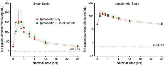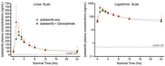 The mean ipatasertib plasma concentration–time profiles for 400 mg QD ipatasertib alone and in combination with 600 mg BID darolutamide are presented in Figure 2.