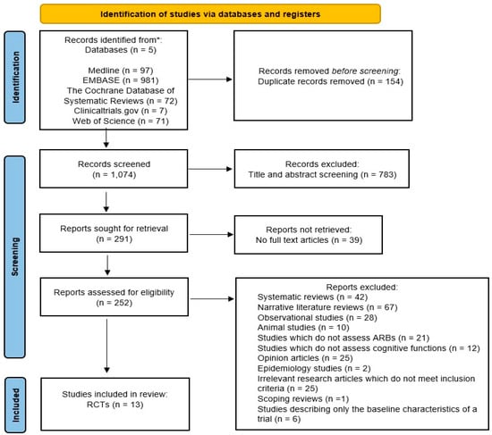 PRISMA diagram. Details of the screening process involved to exclude irrelevant references, which do not meet the inclusion criteria, in order to find appropriate literature to assess the effects of ARBs on cognition or dementia, presented using a PRISMA flowchart [20].