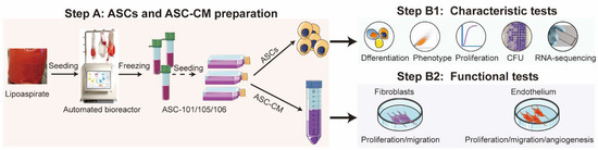 Flowchart of the workflow process. Step A: ASCs from three donors were isolated from lipoaspirate, expanded in an automated bioreactor, and frozen. After thawing, the cells were expanded in flasks from which ASCs were harvested for characteristic tests (Step B1), and conditioned media (ASC-CM) was harvested for functional tests (Step B2). To characterize the ASC, ASCs were seeded at 8,000 cells cells/cm2 in separate T175 culture flasks (Greiner Bio-one, Frickenhausen, Germany), cultured until 80% confluent, washed three times with PBS and then supplied with fresh culture media. After 24 h, the CM was collected, centrifugated at 400× g for 10 min, and the supernatant frozen at −80 °C.
