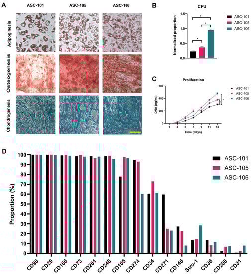 ASCs cultures from three distinct donors were isolated, and a trilineage differentiation assay was carried out to confirm their multipotency. Histochemical analysis showed that all cultures could differentiate into both adipocytes, osteocytes, and chondrocytes (Figure 2A). The colony-forming potential was found to be higher for ASC-106 when compared to ASC-105 and ASC-101 (0.952 ± 0.027 vs. 0.363 ± 0.034 and 0.227 ± 0.02, respectively; both p < 0.0001) (Figure 2B). Furthermore, the colony-forming potential of ASC-105 was found to be higher than that of ASC-101 (0.363 ± 0.034 vs. 0.227 ± 0.02; p = 0.012). The proliferative capacity of ASC-106 and ASC-105 was comparable and both prominently faster than that of ASC-101, giving rise to significantly more cells at day 13 (477.43 ± 19.52 and 376.63 ± 11.93 vs. 302.23 ± 12.63, respectively; p = 0.0004 and 0.03, respectively) (Figure 2C). To evaluate the immunophenotypical profile of the ASCs, a multichromatic flow cytometry assay was performed (Figure 2D). The surface markers evaluated were categorized into five groups, based on their functionality: Mesenchymal stem cell (MSC) markers, ASC markers, differentiation capacity, immune regulation, and wound healing (Table 1). For a more detailed description of the rationale behind the selection of these markers, please refer to our previous paper [43]. The results showed that all ASC cultures were strongly positive for CD90, CD105, and CD73, recognized as the quintessential MSC markers. For the ASC marker group, all ASC cultures were positive for CD34, weakly positive for CD146, and negative for CD31, especially in ASC-101 (0.77%). In the markers relevant for ASC differentiation capacity, all ASC cultures were strongly positive for CD201 and weakly positive for CD36 and Stro-1. ASC markers connected to immune regulation showed CD29 and CD274 to be strongly positive in all ASC cultures, but CD200 was only weakly positive. In the markers related to wound healing, all ASC donors were strongly positive for CD166 and CD248 and positive for CD271.