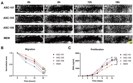 The effects of conditioned media from different ASC cultures (ASC-CM) on the migration and proliferation of dermal fibroblasts. (A): Representative images from different time points of the closure of scratched dermal fibroblasts after ASC-CM treatment in relation to the effect of unconditioned media used as vehicle control (MEM). Scalebar denotes 100 µm. (B): Quantitative assessment of the effect of ASC-CM on the development of scratch size over time (n = 8). The area is normalized to the starting area of each scratch. (C): The proliferation of dermal fibroblasts, quantified by the total amount of DNA, after ASC-CM treatment (n = 3). The data are presented as mean + SEM, * indicates a statistically significant change. p < 0.05. ASC, adipose-derived stem cell; MEM, Minimum Essential Media.