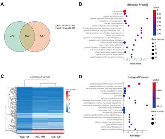Variability in gene expression profiles between ASC-donors (A): A Venn diagram showing the number of upregulated genes and the shared upregulated genes in ASC-105 and -106 compared to ASC-101. (log2FC ≥ 1, Q value ≤ 0.05). (B): Gene ontology (GO) analysis of the biological process of the 158 co-upregulated genes. (C): The heatmap shows the hierarchical clustering of the 158 genes co-upregulated in ASC-105 and ASC-106 compared to ASC-101. The black box highlights the significantly upregulated genes. (D): GO analysis of the biological process of the significantly upregulated genes highlighted the heatmap. ASC, adipose-derived stem cell.