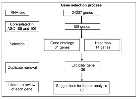 To select the most promising markers predicting wound healing capacity, putative predictors were selected based on the analyses above (Figure 6). In summary, from the pool of 230,487 mRNA transcripts (24,237 genes), 158 genes (Table S1) upregulated in both ASC-105 and -106 compared to ASC-101 were identified (Figure 5A). Next, a combination of the two different analytical approaches were used to select genes of interest among the upregulated genes. From the first approach based on the gene ontology (GO) analysis of all genes (Figure 5B), 31 genes associated with wound-healing-related processes were selected. From the second approach based on the heat map analysis, we identified the 14 most significantly upregulated genes (Figure 5C). Interestingly, between these two approaches, there was an overlap of 10 genes, leading to a total of 35 unique genes (Table 2). Based on a thorough literature review of the 35 genes, we further narrowed the list down to 10 genes of special interest comprising transcription factors (TBX1, EPAS1), membrane proteins (FGFR2, ITGB8, GREM1), and secreted proteins (MMP1, MMP9, COL4A4, FGF9, and CCL11).