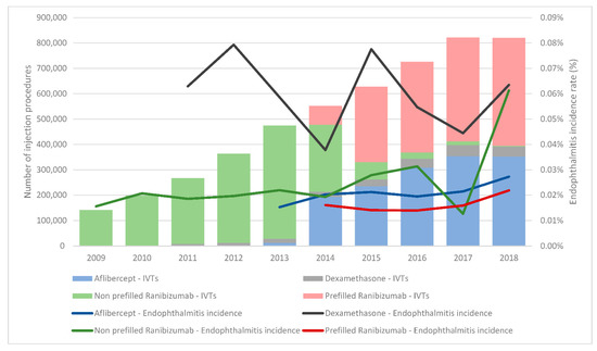 - Baudin, F.; Benzenine, E.; Mariet, A.-S.; Bron, A.M.; Daien, V.; Korobelnik, J.F.; Quantin, C.; Creuzot-Garcher, C. Association of Acute Endophthalmitis with Intravitreal Injections of Corticosteroids or Anti–Vascular Growth Factor Agents in a Nationwide Study in France. JAMA Ophthalmol. 2018, 136, 1352–1358. [Google Scholar] [CrossRef] [PubMed]