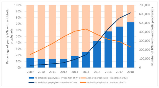 Changes in antibiotic prophylaxis use with IVTs from 2009 to 2018. The years 2009 and 2018 are truncated to allow for the required 42 days of lookback and follow-up.