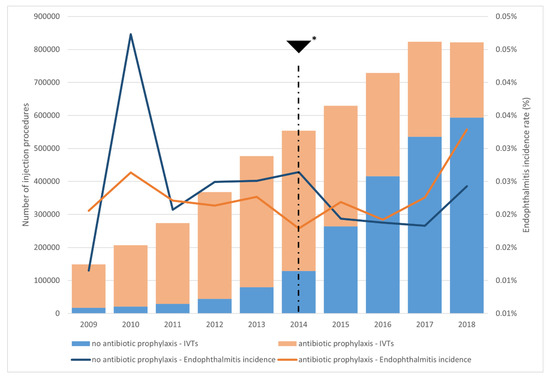 Proportion of IVTs performed with antibiotic prophylaxis per year, and corresponding endophthalmitis rates per year; * 2014, 2nd quarter, publication of the French guidelines on the absence of any benefit from antibiotic prophylaxis and prefilled ranibizumab availability. The years 2009 and 2018 are truncated to allow for the required 42 days of lookback and follow-up.
