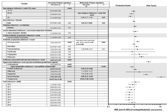 Endophthalmitis occurred mostly after fluoroquinolone, aminoglycoside, and macrolide antibiotic prophylaxes, owing to their more frequent prescription (n = 189, 222, and 439, respectively). No cases or few cases of endophthalmitis were observed under less frequently prescribed antibiotic prophylaxes such as phenicols, polypeptides, fusidic acid, or rifamycin (n = 0, 1, 2, and 8, respectively). In contrast, a higher number of endophthalmitis cases was observed for more frequently prescribed antibiotic prophylaxes such as fluoroquinolones, aminoglycosides, and macrolides (n = 189, 222, and 439, respectively). No statistically significant differences were found for sex and diabetes when considering IVTs with or without endophthalmitis. Patients with endophthalmitis were significantly younger than those without it (78 years (70–84) vs. 79 (71–85), p < 0.001). Endophthalmitis occurred earlier with antibiotic prophylaxis than without: 6.6 days (±7.8) vs. 7.8 (±8.6), respectively (p = 0.01). In univariate analysis, acute post-IVT endophthalmitis was more likely to occur in younger patients, with corticosteroid IVTs, with non-prefilled anti-VEGF syringes (vs. prefilled ranibizumab), and at the beginning of the study period, with a decreasing IRR over the years (Figure 4).