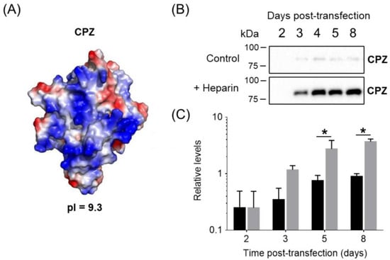 Using this expression pipeline, we successfully expressed the human carboxypeptidase Z (CPZ), which is a human ECM-bound metalloenzyme involved in neuropeptide processing. This protein is extremely difficult to express in the absence of heparin supplementation [23]. In the absence of heparin, most of the produced CPZ in adherent cell cultures is bound to the ECM due to its heparin-binding properties (Figure 2A) [23,29]. As shown in Figure 2B, heparin addition after two days post-transfection resulted in a notable accumulation of the enzyme in the extracellular medium that was up to five-fold higher compared to the unsupplemented expression.