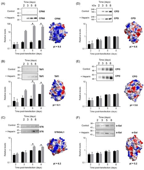 To demonstrate the robustness of our approach on different ECM-binding proteins, we further tested the expression of six additional biomedically relevant enzymes (Figure 3). Three of such proteins (TAFI, CPA6 and ST6GAL1) were expected to have heparin/ECM-binding properties based on previous findings (Figure 3A–C) [30,31,32,33,34,35]. After heparin supplementation, CPA6 protein levels in the conditioned medium were increased about 55-fold after 5 days post-transfection. Similarly, in the case of TAFI, the amount of secreted protein raised to 6-fold after 5 days post-transfection as a result of heparin addition. The smallest improvement was observed for ST6GAL1, for which only a 2-fold enhancement of protein levels was achieved. Interestingly, ST6GAL1 displays a very low pI in comparison to the other four heparin-binding proteins tested. As expected, our approach did not increase the extracellular levels of other proteins without heparin affinity properties, such as human CPD [22], carboxypeptidase O [24] or human α-galactosidase (α-gal) [25] (Figure 3E,F).