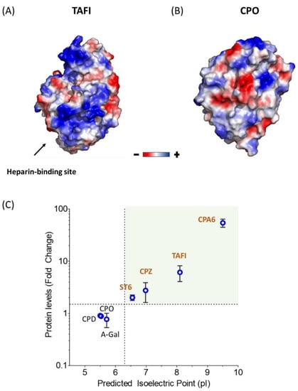 Surface electrostatics clearly plays a major role in heparin/ECM–protein interactions [40]. Typically, these proteins are enriched in basic amino acids such as arginine and lysine. As shown in Figure 2A, the modeled structure of the catalytic domain of human CPZ serves as a prototypical example of the characteristic electrostatic surface potential distribution found in heparin-binding proteins. This model clearly displays a large number of basic residues (i.e., Arg and Lys) clustered at a highly polarized protein surface, which mediate ECM binding [29]. Next, we performed an accurate analysis of all members of the M14 family of proteases. Similar electrostatic surface potential distribution patterns were observed for other enzymes from this protein family such as carboxypeptidase A3 (CPA3), CPA6 or TAFI, all of them with proven ECM/heparin-binding properties. Overall, these proteins have a marked bias towards a basic amino acid content and thus display the most basic isoelectric points (pIs) among all members of the M14 family of proteases (Table S1) [41]. It is also common in these proteins for the local arrangement at the surface of basic amino acids as heparin-binding sites and a clear polarization of basic residues at the protein surface (Figure 5A) [30,41,42]. Such clustering of basic amino acids rarely occurs in other extracellular MCPs without heparin-binding properties (Figure 5B).
