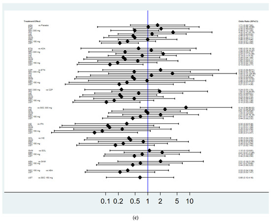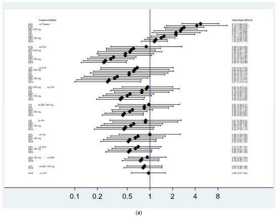 As shown in Figure 3a and Table S2, the NMA found that, when compared with placebo, adalimumab (OR 4.7, 95% CI 2.66–8.29), etanercept (OR 4.19, 95% CI 1.65–10.61), certolizumab pegol (OR 2.83, 95% CI 1.55–5.2), secukinumab 300 mg (OR 2.63, CI 1.62–4.27), infliximab (OR 2.54, CI 1.13–5.69), ixekizumab (OR 2.22, 95% CI 1.06–4.65), golimumab (OR 2.21, 95% CI 1.24–3.93), and abatacept (OR 1.54, 95% CI 1.03–2.28) were more effective in achieving radiographic non-progression at week 24. However, there were no significant differences in achieving radiographic non-progression for secukinumab 150 mg, ustekinumab, and guselkumab when compared with placebo. Regarding the ranking of treatment efficacy, adalimumab (SUCRA 92.8%) was associated with the greatest treatment for achieving radiographic non-progression, followed by etanercept (SUCRA 85.9%).