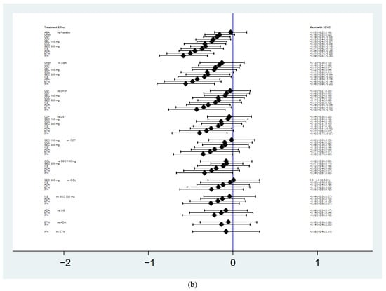The NMA found that, except for abatacept, infliximab (SMD −0.59, 95% CI −0.87, −0.3), etanercept (SMD −0.51, 95% CI −0.78, −0.23), adalimumab (SMD −0.45, 95% CI −0.64, −0.26), ixekizumab (SMD −0.37, 95% CI −0.62, −0.12), secukinumab 300 mg (SMD −0.33, 95% CI −0.50, −0.15), golimumab (SMD −0.33, 95% CI −0.58, −0.09), secukinumab 150 mg (SMD −0.25, 95% CI −0.43, −0.07), certolizumab pegol (SMD −0.23, 95% CI −0.44, −0.03), and ustekinumab (SMD −0.19, 95% CI−0.35, −0.33) were more effective than the placebo in reducing the total radiographic score for structural damage (Figure 3b and Table S3). Additionally, the analysis on SUCRA showed infliximab (SUCRA 91.7%) ranked the best in reducing the total radiographic score, followed by etanercept (SUCRA 82.6%).