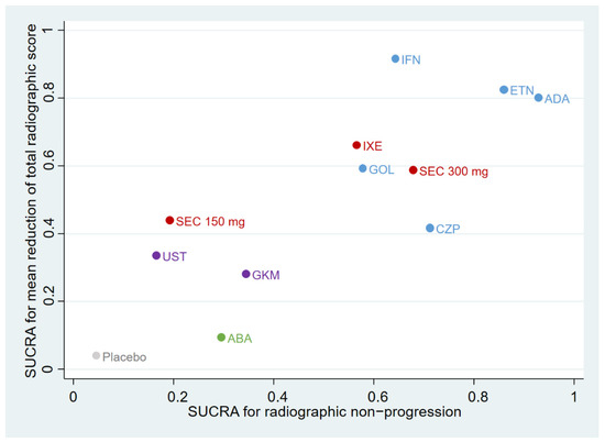 As shown in Figure 4, the ranking plot was based on SUCRA values for two different outcomes: radiographic non-progression and a mean reduction in the total radiographic score. The interventions were divided into four clusters according to their pharmacologic effects. The group in blue comprised anti-TNF agents (infliximab, etanercept, adalimumab, golimumab, and certolizumab pegol); the group in red comprised IL-17A inhibitors (ixekizumab and secukinumab); the group in purple comprised the IL-12/23 inhibitor (ustekinumab) and the p19 subunit of the IL-23 inhibitor (guselkumab); and the group in green comprised the selective T-cell costimulation modulator inhibitor (abatacept). Adalimumab, infliximab, and etanercept were the top three treatments after considering both efficacy outcomes.