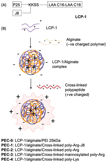LCP-1, a self-adjuvanting lipopeptide, was complexed with negatively charged polysaccharide alginate to produce anionic particles. These particles were then coated with biodegradable cationic cross-linked polymers, namely poly-Arg-J8, poly-Arg, mannosylated poly-Arg and poly-Lys, to produce polyelectrolyte complexes PEC-1 to PEC-4, respectively. Based on previous studies, many formulations including poly-Arg and poly-Lys were used safely in vivo without showing any level of toxicity [9,37,38,39].
