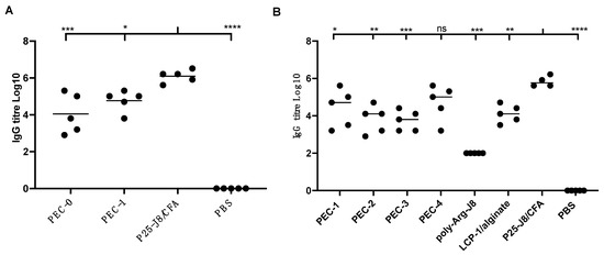 J8-specific IgG antibody titres in female BALB/c mice (n = 5) following subcutaneous immunisation with vaccine candidates and controls. (A) Results from the first animal study, with PEC-0, PEC-1, P25-J8/CFA and PBS. (B) Results from the second animal study, comparing PEC-1 to PEC-4 and controls that included poly-Arg-J8, LCP-1/alginate and P25-J8/CFA. Bars represent the average antigen-specific antibody titre. (ns, p > 0.05; *, p < 0.05; **, p < 0.01; ***, p < 0.001; ****, p < 0.0001 compared to P25-J8/CFA).