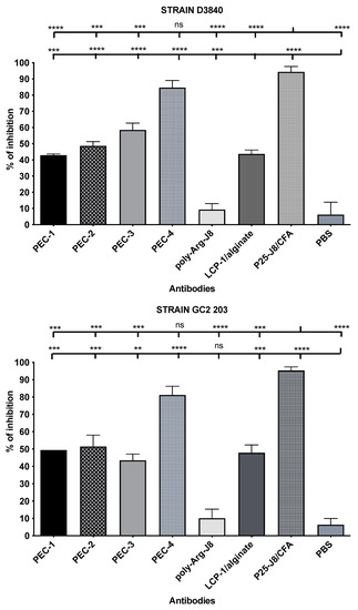 Antibodies produced in the sera by immunised mice were used to determine opsonic activity against two strains of GAS clinical isolates (Figure 3): D3840 and GC2203, isolated from a nasopharynx swab and wound swab, respectively. Opsonic abilities were calculated based on the reduction of CFU compared to sera from negative control mice, determining the quality and effectiveness of the antibodies. Antibodies produced by mice immunised with PEC-4 had comparable opsonic activity to the positive control group (P25-J8/CFA), while those of all other mice were significantly less opsonic. PEC-1 to PEC-3 sera had similar levels of opsonic activity, despite the higher overall dosage of antigen introduced by PEC-1. Thus, cross-linked poly-Lys (PEC-4) was better able to stimulate the immune system and produced higher opsonic antibody titres compared to poly-Arg (PEC-1 to PEC-3). Interestingly, simple poly-Arg (not cross-linked) was previously shown to be effective in inducing humoral immunity [42], while poly-Lys lacked immune stimulating ability [41]. The higher efficacy of poly-Lys compared to poly-Arg in the current study may be related to non-specific uptake of poly-Arg (as a cell penetrating peptide) by non-immune cells [40]. Alternatively, cross-linking of poly-Lys could have altered its immune stimulating potency.