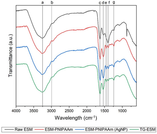 Fourier transform infrared spectrophotometer (FT-IR) spectra. Representative FT-IR summarising the chemical bonding structure in the raw ESM, as well as alterations results from modification protocols, i.e., raw ESM and modified ESM (ESM-PNIPAAm, ESM-PNIPAAm (AgNP), TG-ESM). Vertical lines (a, b, c, d, e and f) identify the distinctive peaks associated with the bands: Amide A (3275 cm−1), AAmide B (2970 cm−1), AAmide I (1630 cm−1), AAmide II (1535 cm−1), CH2, CH3 groups, and Amide III (1250 cm−1) respectively. Unlike the raw ESM, spectra of the modified membranes show a shift of the AAmide II peak (1535 cm−1) at a higher intensity and additional smaller peaks within the wavelength region of 1300–1450 cm−1, indicating CH2 and CH3 groups and C-H bending.