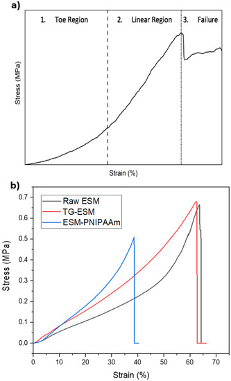 Tensile profile of the raw and modified ESM. (a) The general stress-strain profile of the ESM. (b) representative stress-strain curves of the raw and modified ESM (ESM-PNIPAAm (AgNP) and TG-ESM).