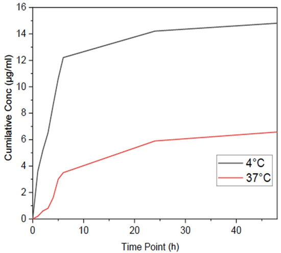 Ultraviolet-visible (UV-Vis) spectroscopy was used to monitor the release of AgNP from the ESM-PNIPAAm (AgNP)-modified membrane. Samples were assessed at 380 nm, which corresponded to the absorbance wavelength of the commercially available AgNP (i.e., 380–405 nm). To establish the thermoresponsive properties of PNIPAAm, the release of AgNP was monitored at 4 °C and 37 °C (Figure 6). A significant increase of AgNP was observed within the first 8 h from the ESM-PNIPAAm (AgNP) at 4 °C. The spectra indicate that at temperatures below the LCST (4 °C), the NP are entirely released within 1–8 h, after which the concentration plateaus.