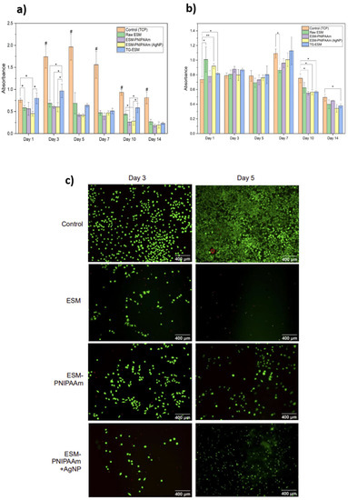 L929 cells were seeded on samples of the raw ESM, ESM-PNIPAAm and ESM-PNIPAAm (AgNP) and stained with a Live/DeadTM cytotoxicity assay kit to determine the in vitro viability and cytotoxicity of the dressing. The effect of the sample materials on cell viability was qualitatively validated using fluorescence microscopy (Figure 7c) in which the control groups (TCP) exhibited very high cell viability and contained minimal dead cells after 3 and 5 days, while after 3 days of incubation with each of the test samples, most cells remained viable, although the cell number was not as high as the control. Interestingly, after 5 days, the ESM-PNIPAAm and ESM-PNIPAAm (AgNP) samples showed a sustained cell viability.