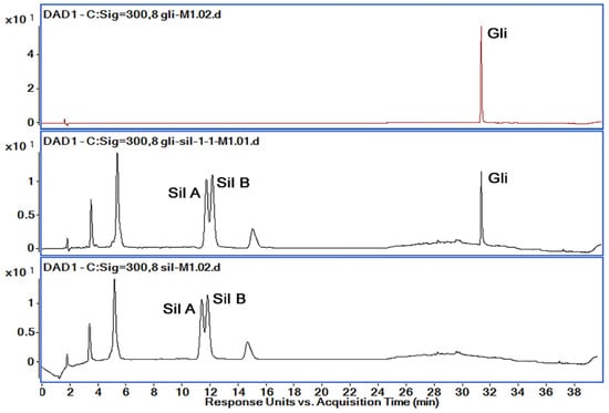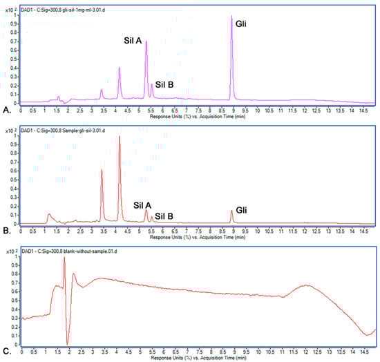 - Korany, M.A.; Haggag, R.S.; Ragab, M.A.A.; Elmallah, O.A. A validated stability-indicating HPLC method for simultaneous determination of Silymarin and Curcumin in various dosage forms. Arab. J. Chem. 2017, 10, S1711–S1725. [Google Scholar] [CrossRef]