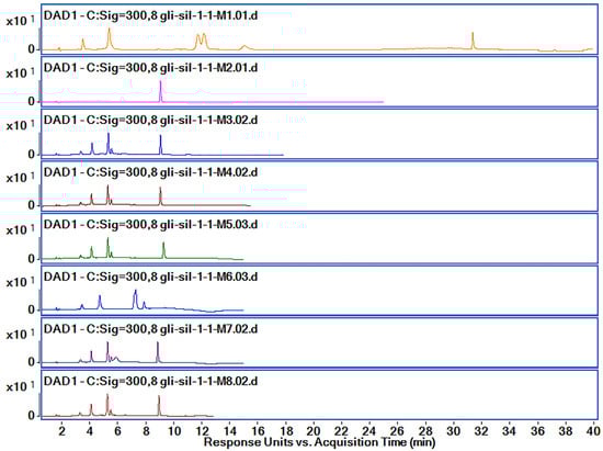 | M8 | 5.22 | 179.8 | 5.46 | 31.7 | 8.9 | 154.3 | good peak separation and bigger peak area for all compounds |