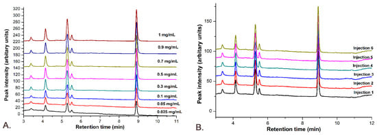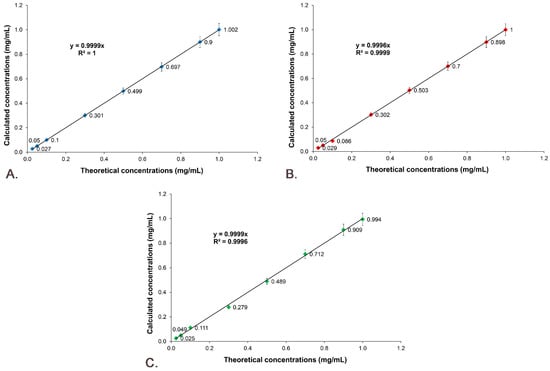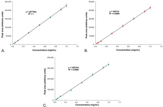 3.6. Active Substances’ Calibration Curves