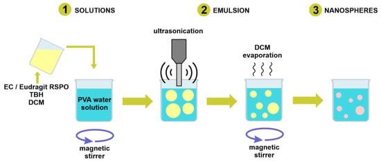 Particles were prepared with the modified method described by Božič et al. []. Briefly, the polymer and the drug were dissolved in DCM. Next, the organic phase (internal phase) was added to PVA solution (external phase) and mixed with a magnetic stirrer at rate of 450 rpm in a closed vial for 10 min. The resulting oil/water emulsion was ultrasonicated with a Branson Digital Sonifier SFX 150 (Emerson Electric Co., St. Louis, MO, USA) equipped with a microtip probe, in pulse mode with 0.7 s on and 0.3 s off, at 70% output energy. The emulsion was then left uncapped, stirring at 450 rpm at room temperature under a chemical fume hood overnight, for residual solvent evaporation. The scheme depicting basic steps of the particle formation is presented in Figure 1. Following solvent evaporation, the suspension was transferred to 13.5 mL Quick-Seal® polypropylene tubes (Beckman Coulter, Brea, CA, USA). The tubes were filled with deionized water and sealed. The samples were centrifuged at 20,000 rpm for 15 min at 18 °C with an Optima™ L-90K Ultracentrifuge (Beckman Coulter) equipped with a 70.1 Ti rotor. Next, the supernatant was discarded, and the pellet was collected, redispersed in deionized water, and centrifuged again with the same procedure. After the removal of the supernatant, the pellet was transferred to a vial, redispersed in 5 mL of deionized water, and shaken overnight to obtain an aqueous suspension of the drug-loaded nanospheres.