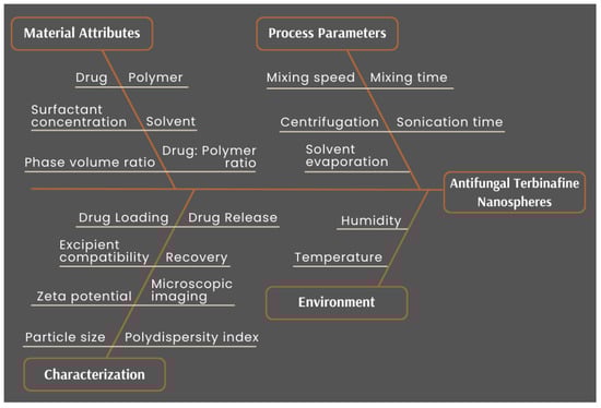 Figure 3 is the Ishikawa diagram (also known as “fishbone” or “cause-effect” diagram) which helps highlight the various material and process attributes that could impact the quality of the nanospheres. The material-related factors that could influence product quality range from choice of drug and polymer, to their concentrations or ratios. Other material factors are surfactant in the external phase and its concentration. It is known that the volumes of the internal and external phases could also affect the properties of the particles []. Therefore, the process parameters involved in the various stages of nanosphere development were included, such as mixing the primary emulsion, ultrasonication parameters to create a finer emulsion, solvent evaporation of DCM to leave the nanospheres in the suspension, and even the ultracentrifugation step for washing the particles that alter the final quality of the formed nanospheres. It also captured the conditions of the preparation that could affect product quality, along with the characteristics that needed to be studied to confirm that the desired nanospheres were achieved.
