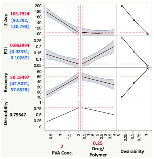 The preliminary and secondary experimental trials provided the required information to design the final DoE that included PVA concentration and drug to polymer ratio as the independent variables at three levels each. The PVA concentration was varied at levels of 0.25, 1 and 2% w/v, and the drug to polymer ratio was varied at levels of 1:4, 1:1 and 4:1, making a 32 factorial design. A power analysis was performed to obtain the minimum number of replicates and center points, hence experimental trials needed to obtain a statistically confident outcome. For this analysis, a 20-run design was compared against 18, 22, 24, and 27-run designs that were obtained by changing the number of replicates and center points. This resulted in a 32 factorial design matrix with 20 experimental runs containing duplicate trials and one center point. Table 3 summarizes the variable levels, responses and experimental design specifications used in the final design. The responses included in this optimization included recovery (%) along with Z-ave (nm) and PDI.
