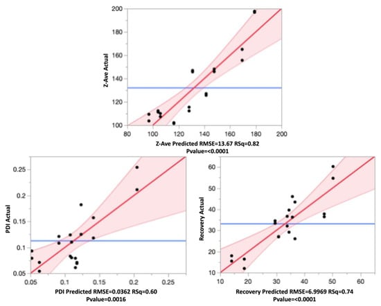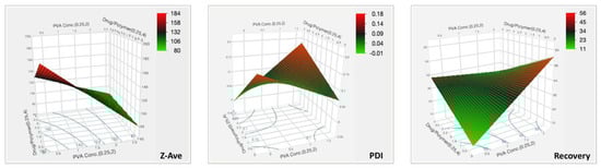 where Y represents the response, which denotes each of the quality attributes of the product; X1 and X2 represent the main effects of the factors being varied; X1X2 represents the interaction effect of the independent variables; β0 denotes the arithmetic mean of quantitative outcomes from all the experimental runs; and β1, β2 are estimated coefficients from observed values of Y for both the factors. Based on Table 3 above, linear regression analysis was performed for each of the three responses—Y1 (Z-ave), Y2 (PDI), and Y3 (recovery); while X1 and X2 were the PVA concentration and drug to polymer ratio, respectively.