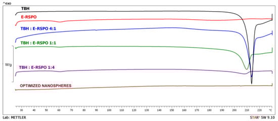 Physical mixtures containing TBH and E-RSPO at 4:1, 1:1 and 1:4 weight ratios, as well as solid residues obtained from drying 1 mL of optimized nanosphere suspensions, were investigated in DSC studies. The samples (1–3 mg) were placed in aluminum 40 μL crucibles with pierced lids. The experiments were performed with the DSC 823e (Mettler Toledo, Columbus, OH, USA) differential scanning calorimeter equipped with a TSO801RO sample robot and Julabo FT 100 intracooler. During the experiment, the temperature was increased linearly from 25 to 230 °C at a rate of 10 °C min−1 under a constant flow of nitrogen (30.0 mL min−1). An empty crucible was used as a reference. The obtained thermograms were analyzed with STARe Software version 9.10 (Mettler Toledo, Columbus, OH).