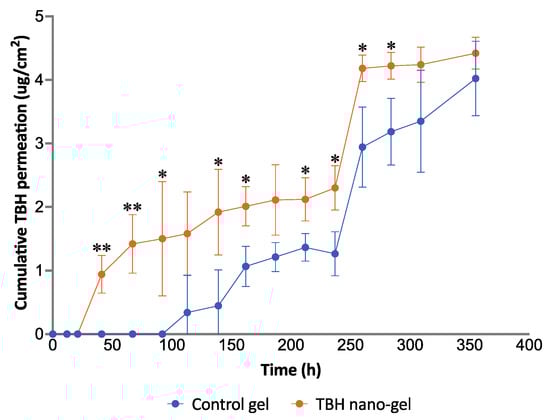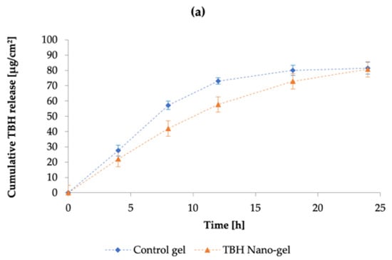 The in vitro release testing (IVRT) of TBH from the nanosphere suspension and the nanosphere-loaded gels was studied using SnakeSkin Dialysis Tubing, 10K MWCO (Thermo Fisher Scientific, Waltham, MA, USA) sandwiched between the donor and receptor chambers of vertical Franz diffusion cells (Logan Instruments, Somerset, NJ, USA) with a receptor volume of 5 mL and an effective diffusion area of 0.64 cm2. The receptor compartment was filled with PBS (pH 7.4) containing 40% (v/v) ethanol to achieve sink conditions and contained a 3 mm magnetic stir bar for constant stirring of receptor media at 600 rpm. The assembled Franz cells were placed in FDC-24 heat blocks (Logan Instruments, Somerset, NJ, USA) set at 37 °C, and were allowed to equilibrate for 15 min before applying the formulations in the donor compartment. All formulations were applied in excess to achieve an infinite dose of TBH. Samples of 300 µL were withdrawn through the sampling arm of the Franz cells at predetermined time points followed by immediate replenishment with the same volume of fresh receptor media. The pre-validated HPLC method was used to determine the drug content of each sample, and cumulative drug contents were plotted against the time to obtain the release profile.