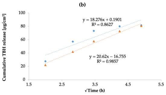 The content of TBH in the samples described above was quantified using an Agilent 1100 Series HPLC system with an autosampler combined with a UV detector, and a reverse phase Eclipse XDB-C-18 column (150 mm × 4.6 mm; 5 µm) (Agilent Technologies, Santa Clara, CA, USA) maintained at 40 °C. The method consisted of a gradient elution, with the mobile phase being acetonitrile and water, both containing 0.1% (v/v) formic acid starting at a ratio of 35:65 (v/v) and changing to 80:20 (v/v) over four minutes, maintained for the run time of 10 min, with a 2 min post run at a flow rate of 1 mL min−1. With an injection volume of 10 µL and UV-visible detection at 284 nm, the analyte peak was observed at 3.6 min. The method was validated with respect to linearity, precision, accuracy, and repeatability. Calibration curves were constructed with concentrations ranging from 25 µg/mL to 1000 µg/mL, as well as from 1.5 µg/mL to 100 µg/mL, and linear regression analyses showed a coefficient of correlation, R2 > 0.99 for both curves. The LOD and LOQ were 0.01 and 0.03 µg/mL, respectively.