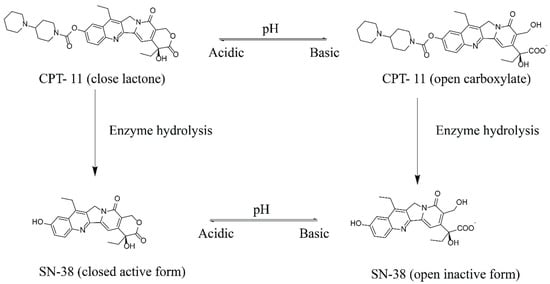 Drug instability is another significant barrier to developing an effective SN-38 therapy. At physiological pH (pH 7.4), SN-38 will be in its open carboxylate form, which shows no therapeutic effect. Furthermore, the active form of SN-38 is only stable at pH ≤ 4.5, and, with an increasing pH, the molecule undergoes hydrolysis with a structural change from a closed active lactone ring to an open inactive carboxylate form. As represented in Figure 1, both active and inactive forms are in equilibrium at pH 6.7.